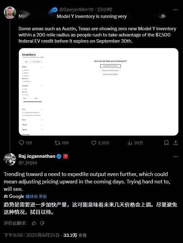 特斯拉公司负责IT、人工智能基础设施、应用程序、信息安全及车辆服务运营的副总裁Raj Jegannathan在社交媒体上透露,公司正在评估对Model Y进行小幅涨价的可能性。此番价格调整似乎是为了应对预期中的产量增长。